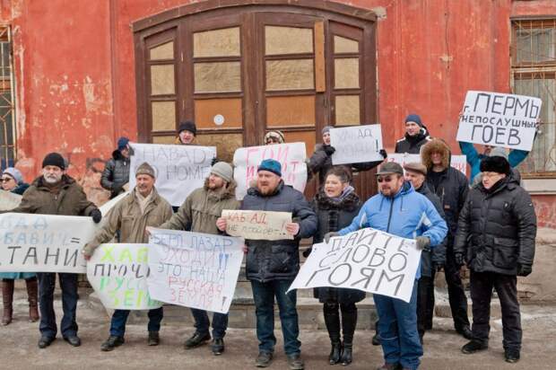 Пикет против строительства мечети "Хабад Любавич" в Перми. Понимают ли раввины Хабада из Израиля и США, что своими хамскими заявлениями лишь провоцируют недовольных? Ещё как понимают. Но... ведь с недовольными придётся иметь дело российским евреям, а не им...