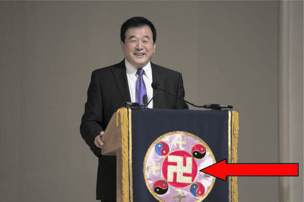 Ли Хунчжи, лидер "Фалуньгун". На трибуне - символ организации. Конечно, её адепты скажут, что это - "древний символ Солнца", но их деятельность говорит - другое.
